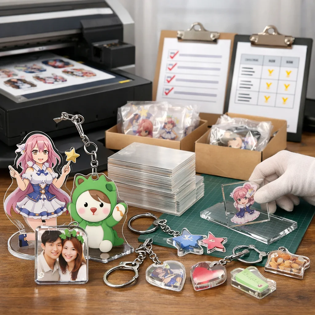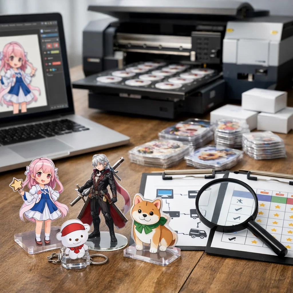アクリルグッズの受注生産を行う際には、これらの流れを理解し、適切な準備を整えることで、より円滑に進行できます。そして、クオリティの高いアクリルグッズを顧客に届けるために、各工程での注意が不可欠です。