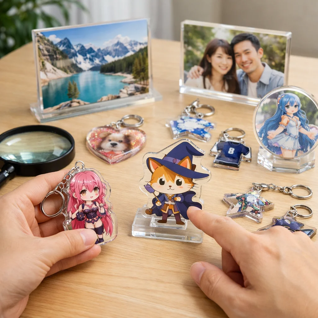 アクリルグッズ選びでは、アクリルスタンド、アクリルキーホルダー、アクリルブロック、アクリルバッジそれぞれのポイントを注視しましょう。特に、台座や金具の質、厚み、印刷面保護の確認が重要です。サンプルを通じて特性を把握し、自分に合ったアイテムを見つけることが大切です。