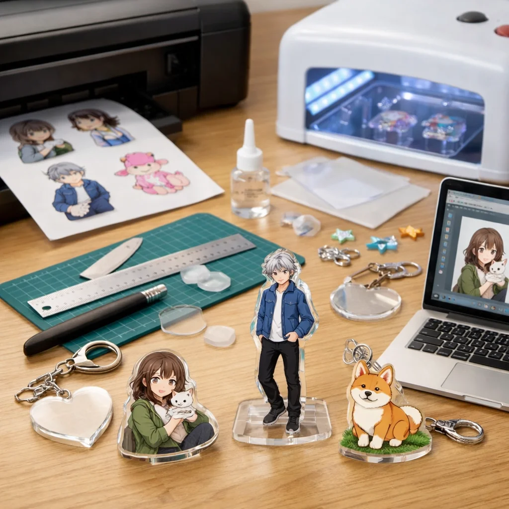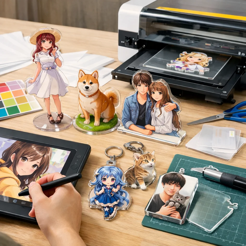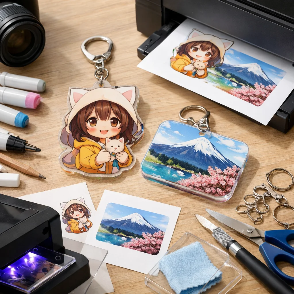 次に、印刷サービスを利用する方法があります。こちらは専門業者にデザインを依頼し、アクリルグッズを制作してもらいます。この場合、難易度は低く、誰でも簡単に注文することができます。初期費用も比較的安価で、少量から注文が可能なサービスも多いため、初めての方や販売を考える方にもおすすめです。ただし、仕上がりは業者のクオリティに依存するため、デザインに自信がない方でも安心して依頼できます。