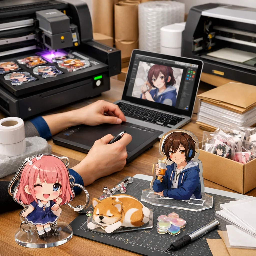 アクリルグッズが受注生産に適している理由は、その加工の柔軟性と多様性にあります。アクリルは、軽量で強度があり、印刷や加工が容易であるため、個人の趣向や企業のブランディングに合わせた製品を作ることができます。特に同人活動を行うクリエイターや、アーティスト、企業のノベルティ製品としての需要は高まっており、受注生産がぴったりです。