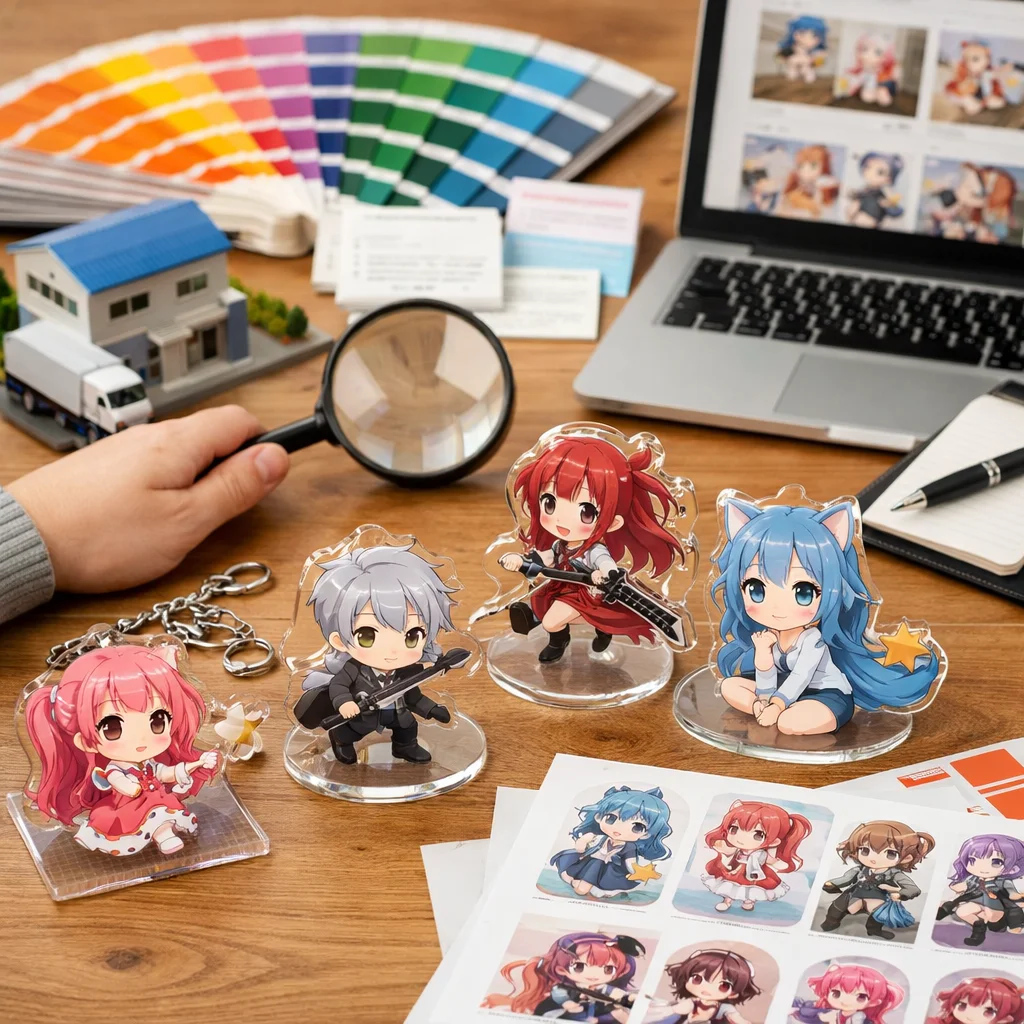 以上のように、アクリルグッズは同人活動において多様な役割を果たしていますが、業者選びにおいても重要なポイントがあります。アクリルグッズの制作を依頼する際、業者選びの基準として“用途”が仕様決定に直結することを理解することが不可欠です。つまり、何を目的にアクリルグッズを作成するのか、その用途によって必要な素材や加工方法、価格設定が変わってきます。