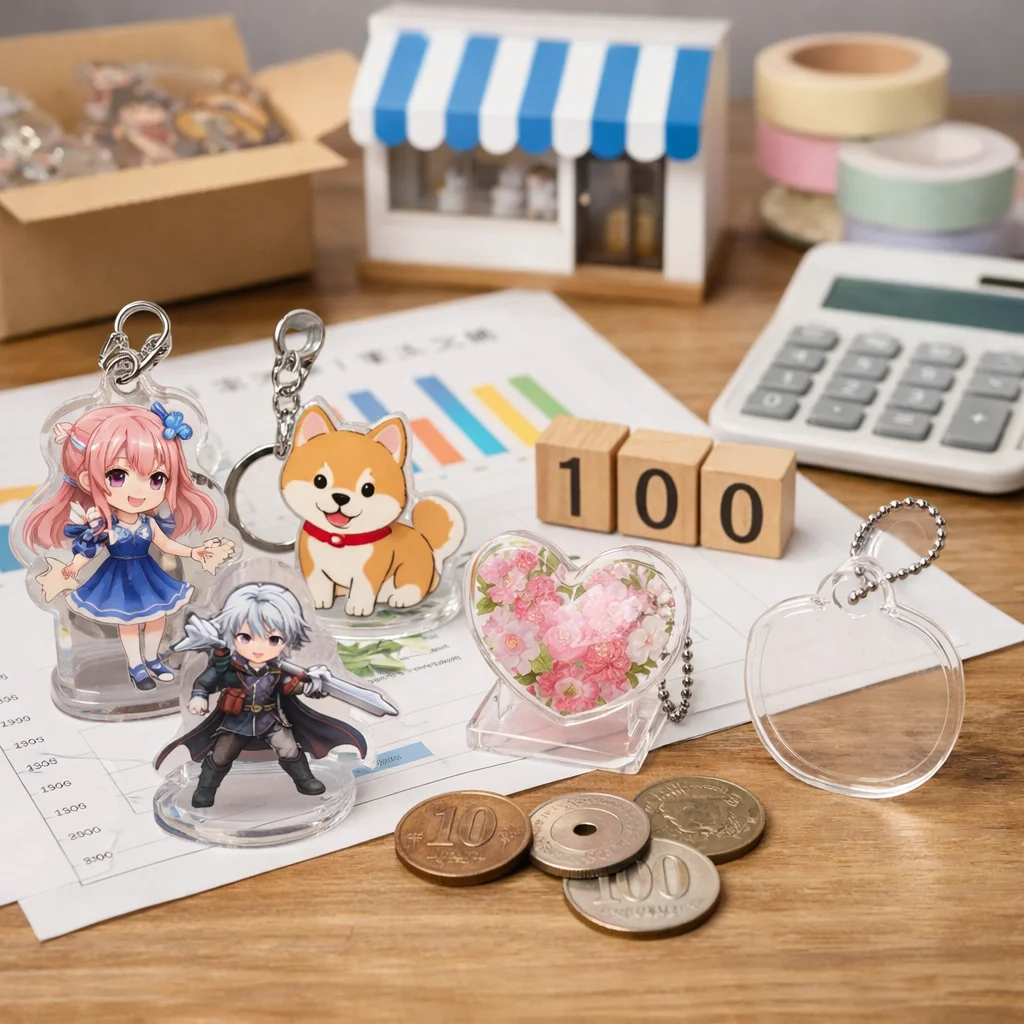 これらの例から、小ロットでの注文は、アクリルグッズの価格が高くなる傾向が見受けられます。特に、最小ロットでの注文は、製造効率の低下やコスト増加の影響を直接受けやすいことがわかります。