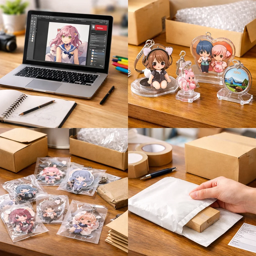 – 業者: 梱包が完了したアクリルグッズを指定された方法で発送します。