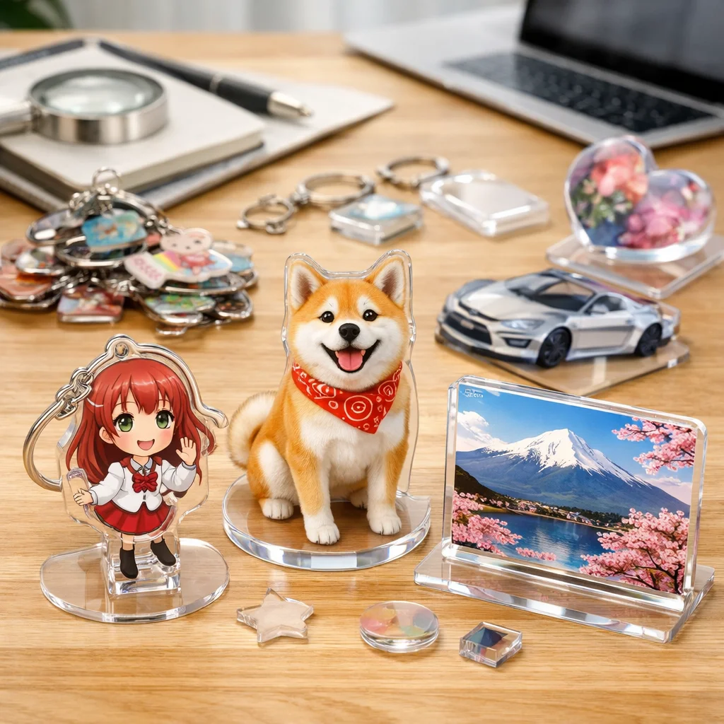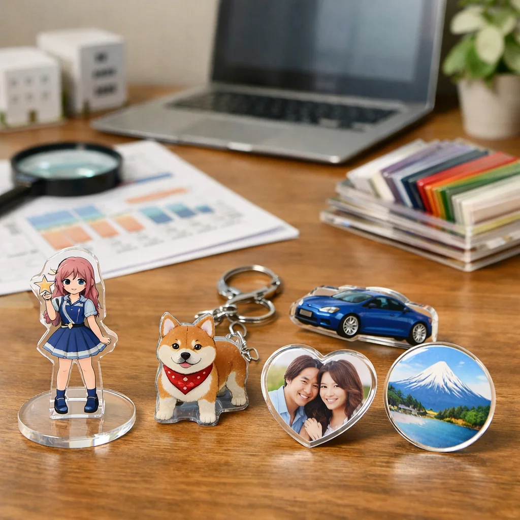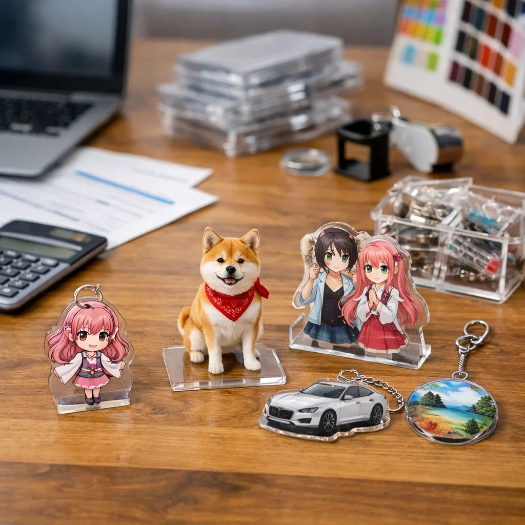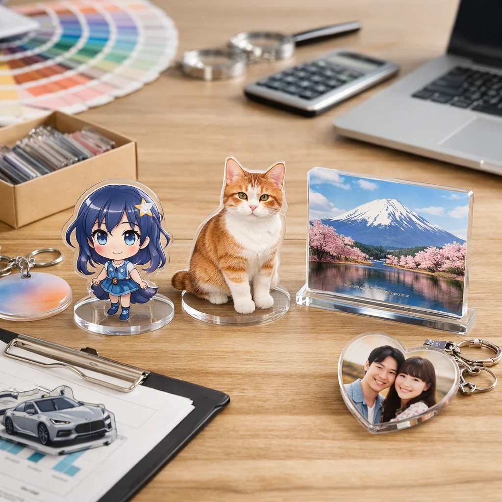 - 対応アイテム(アクキー、スタンドなど):多様なアイテムに対応している業者を選ぶことで、必要なアクリルグッズが一カ所で揃い、無駄な時間を省けます。