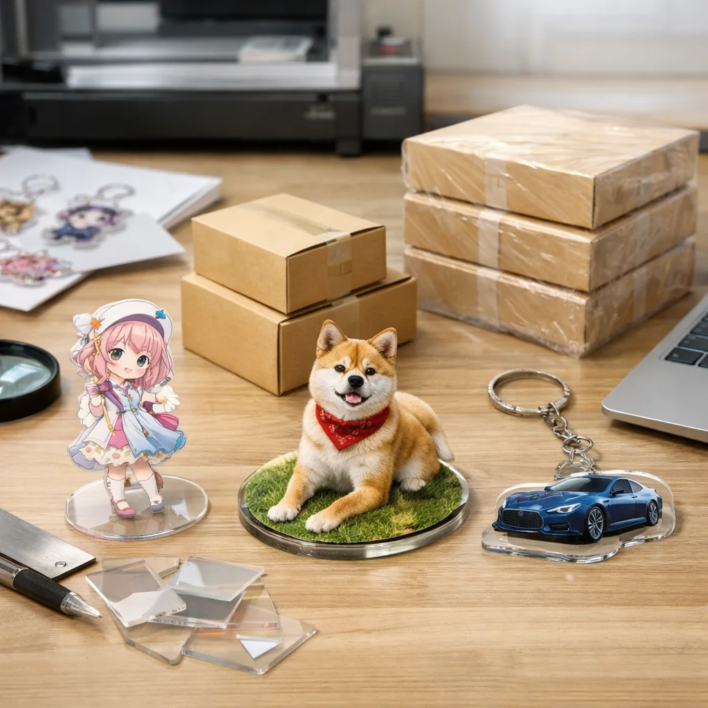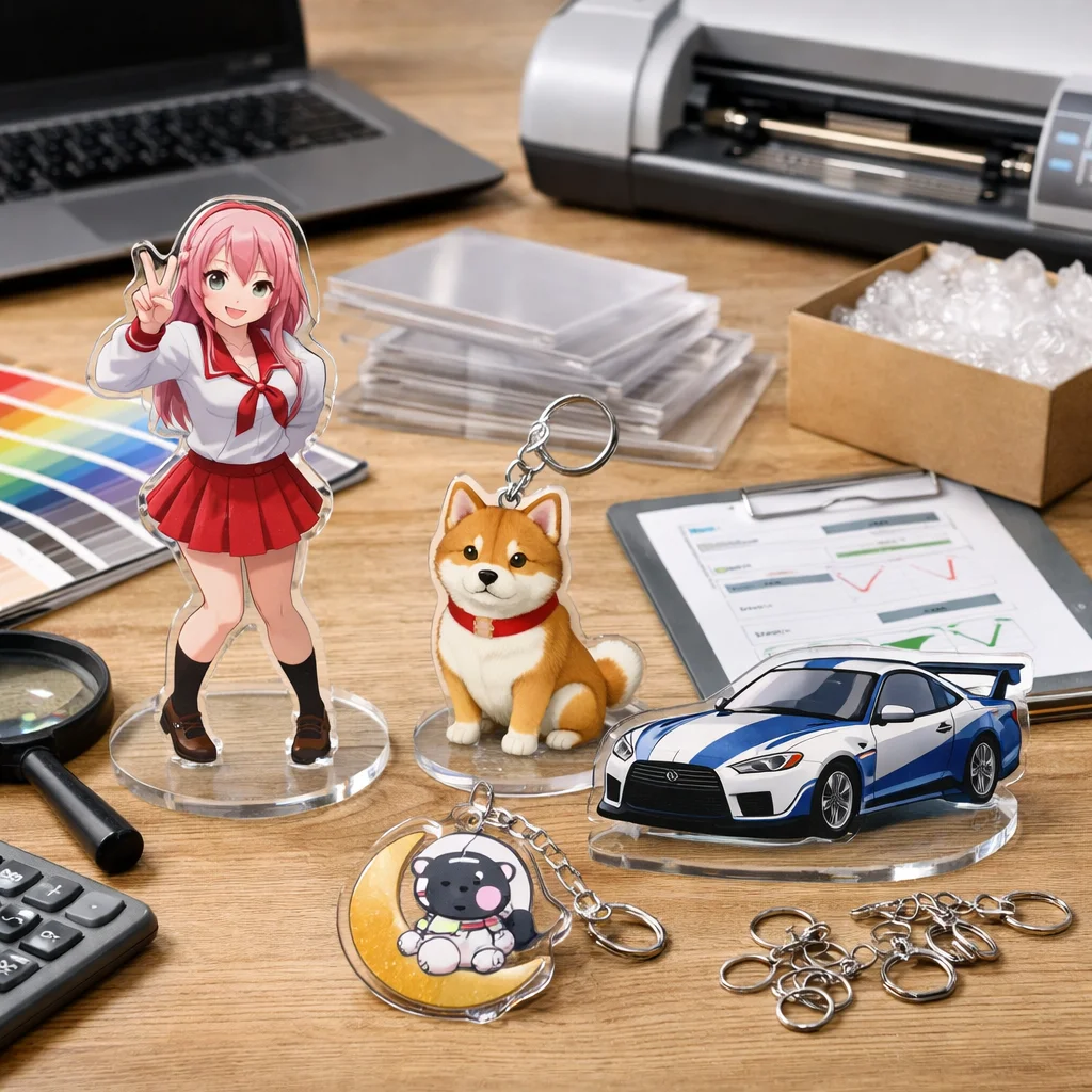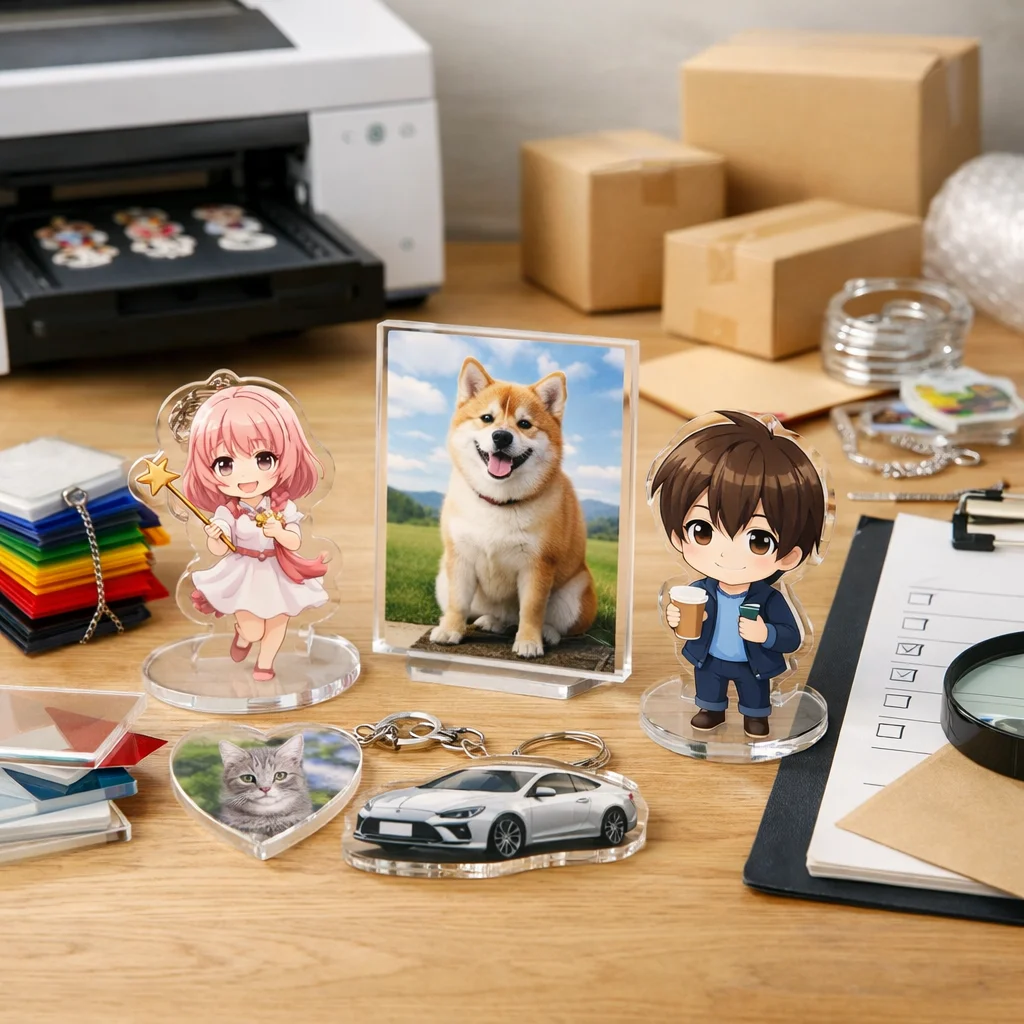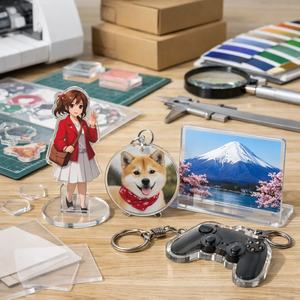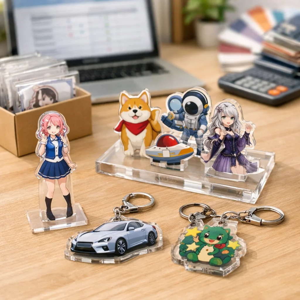 - 対応アイテム(アクキー、スタンドなど):多様なアイテムに対応している業者を選ぶことで、必要なアクリルグッズが一カ所で揃い、無駄な時間を省けます。