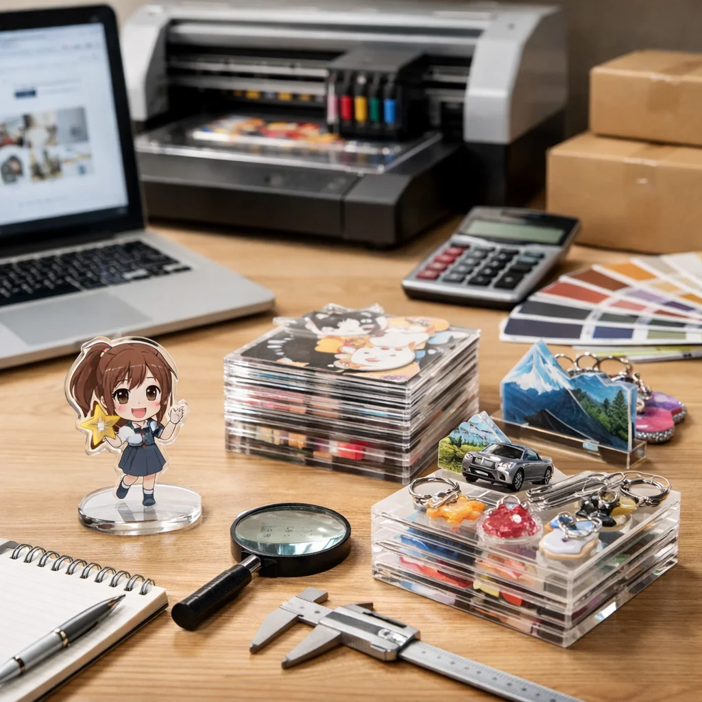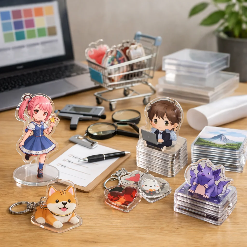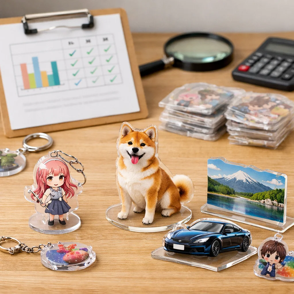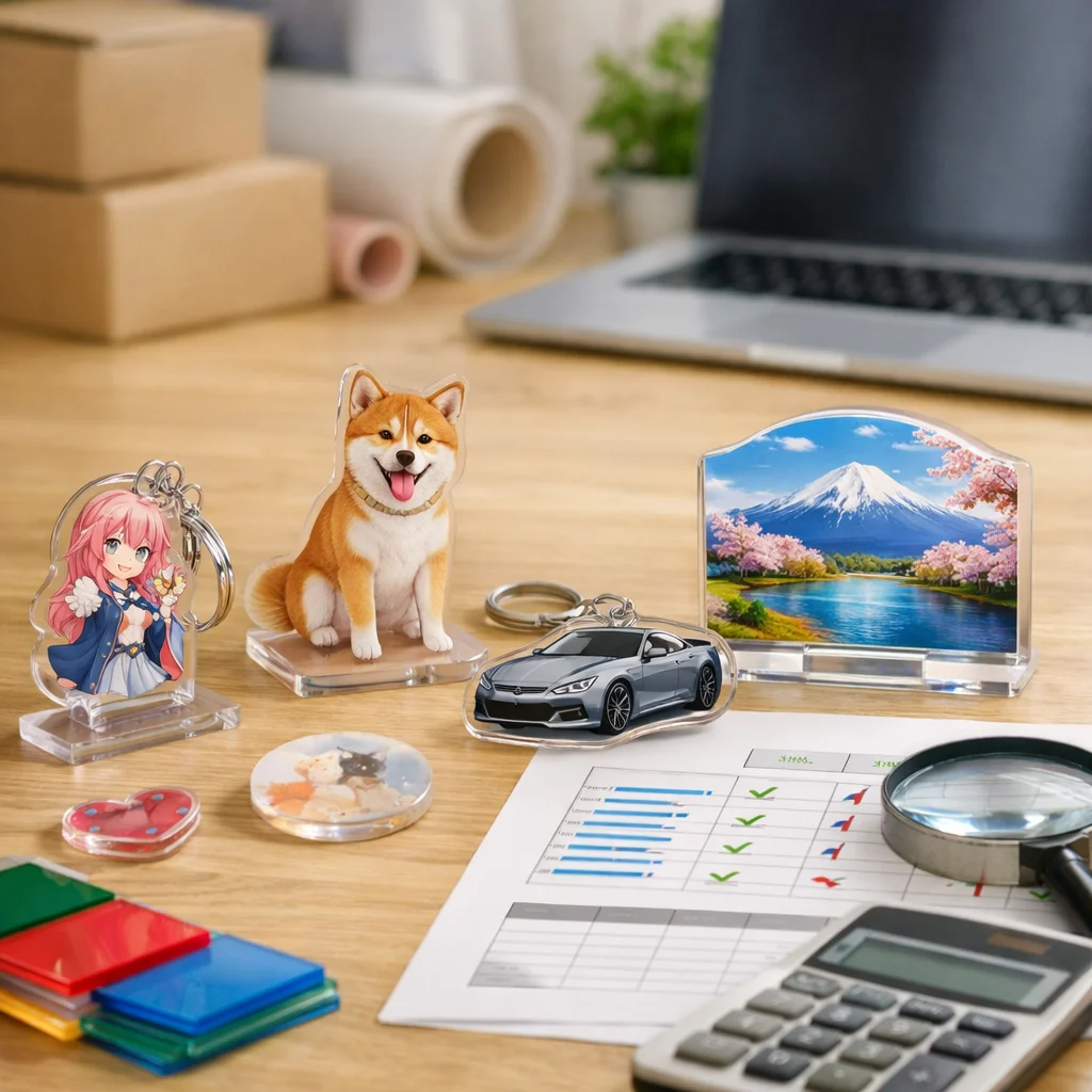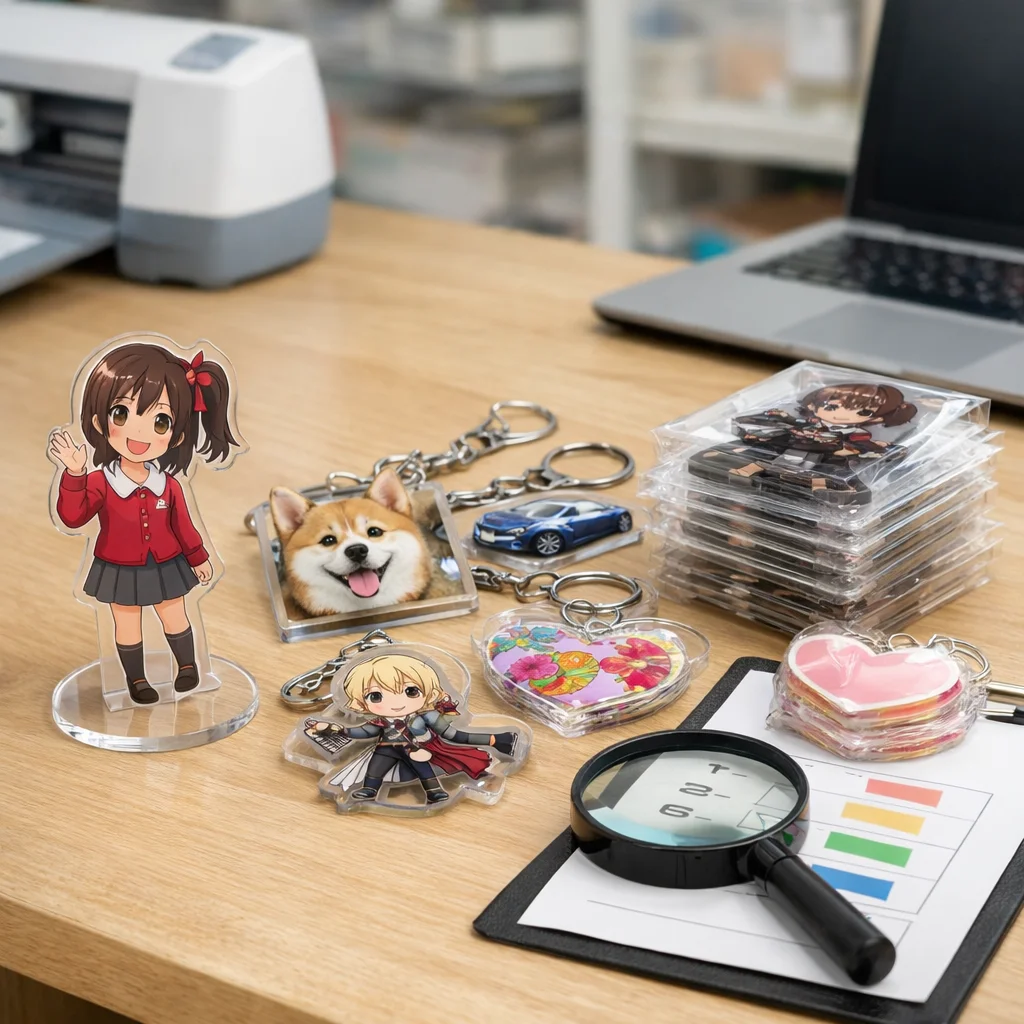 アクリルグッズを製作する業者を選ぶ際は、対応アイテム、最小ロット、入稿形式、色味、カット精度などのチェックポイントが重要です。これらをしっかり確認することで、満足のいく商品の仕上がりを実現し、コストや納期のトラブルを回避できます。
