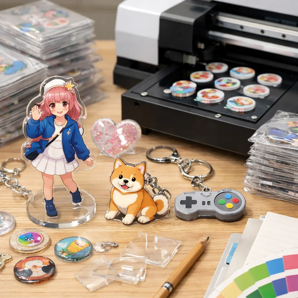 アクリルグッズは、現在さまざまな場面で利用されており、その種類も豊富です。特に人気のあるジャンルとしては、アクリルキーホルダー(通称アクキー)、アクリルスタンド(アクスタ)、アクリルブロック、フォトプロップス、ルームキーホルダーなどがあります。これらのアクリルグッズを100個制作する際には、用途、単価感、制作難易度、さらには向いているデザインについて整理することが重要です。