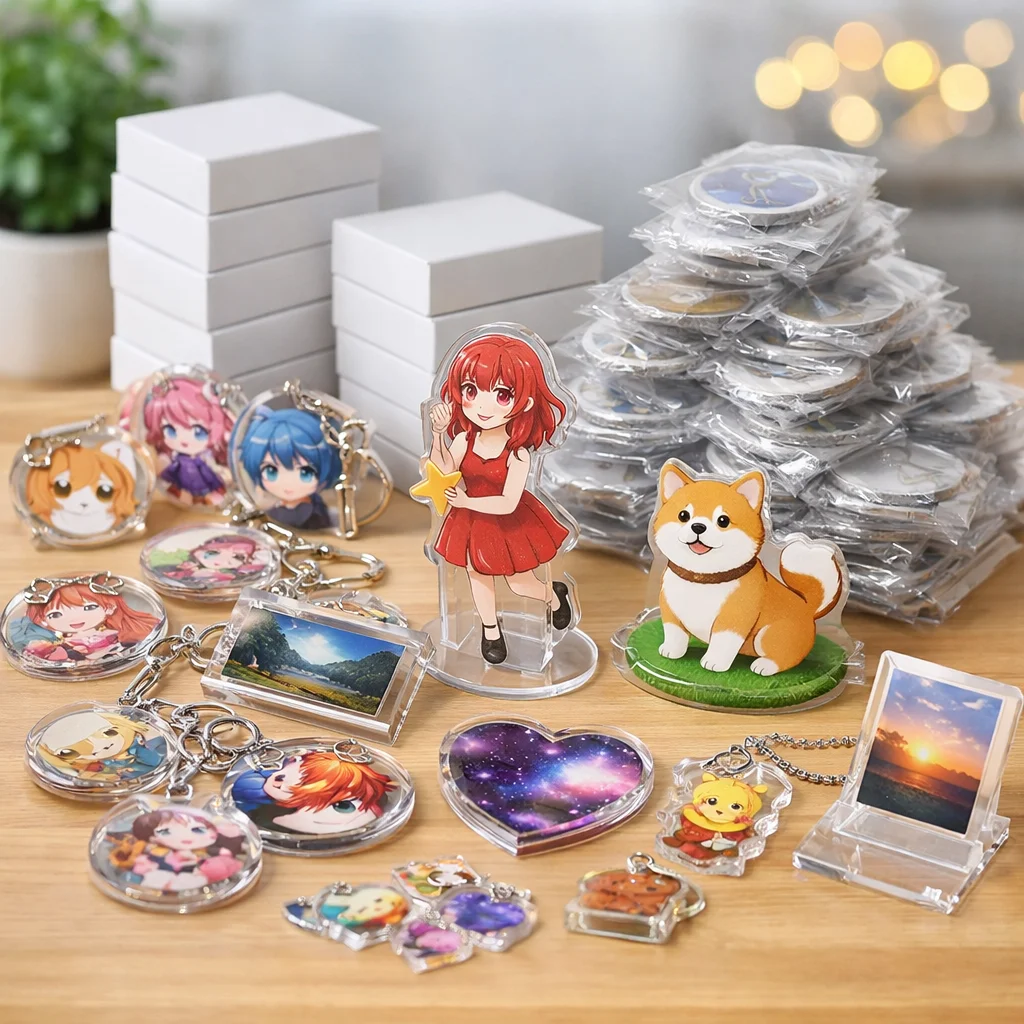 アクリルグッズの種類には、アクリルキーホルダーやアクスタ、アクリルバッジなどがあります。100個発注時の目安単価は、種類や印刷方法、サイズ、加工内容によって異なります。様々な条件を考慮して発注を検討しましょう。