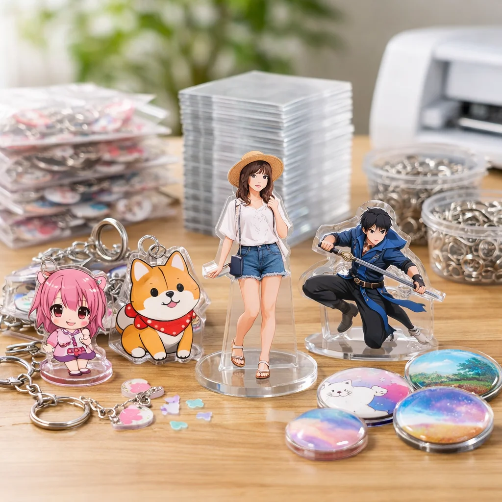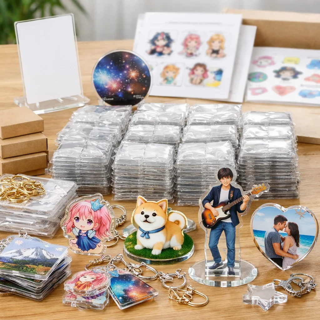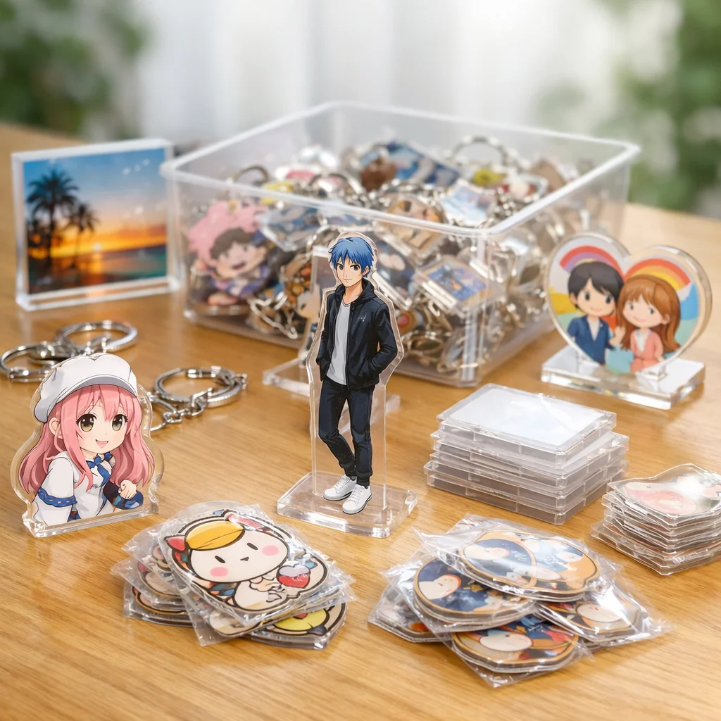 アクリルグッズは、その多様なデザインと機能性から、個人の趣味から企業のプロモーションまで幅広い用途で人気を集めています。特に、アクリルキーホルダー、アクリルスタンド(通称アクスタ)、アクリルバッジ、アクリルチャーム、アクリルコースター、アクリルスタンドプレートなどの製品は、100個単位での発注が一般的です。