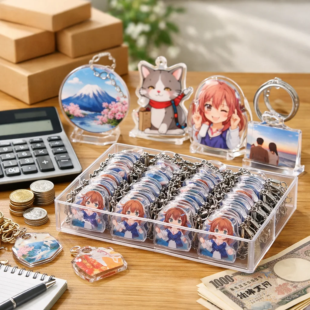 – アクリルキーホルダー:売価は500円〜700円。原価は100個で約37,000円〜60,000円。