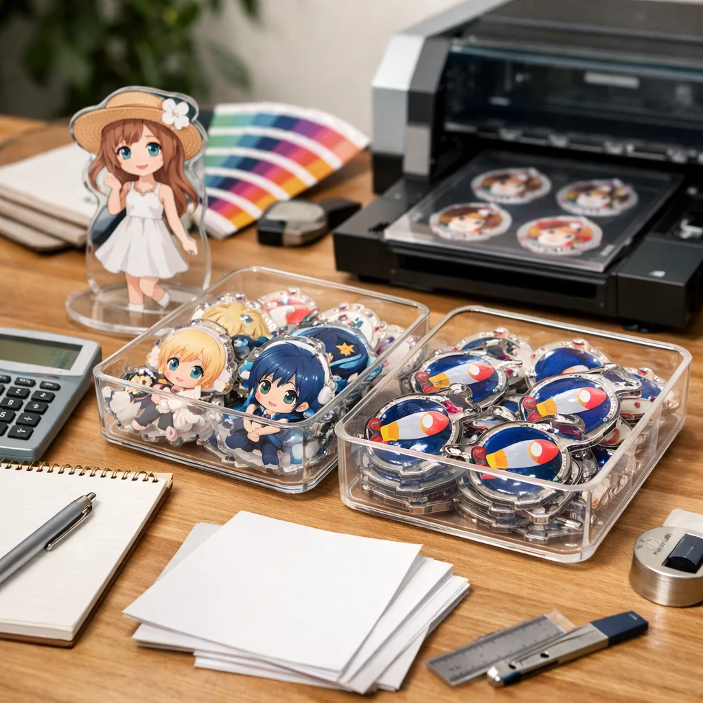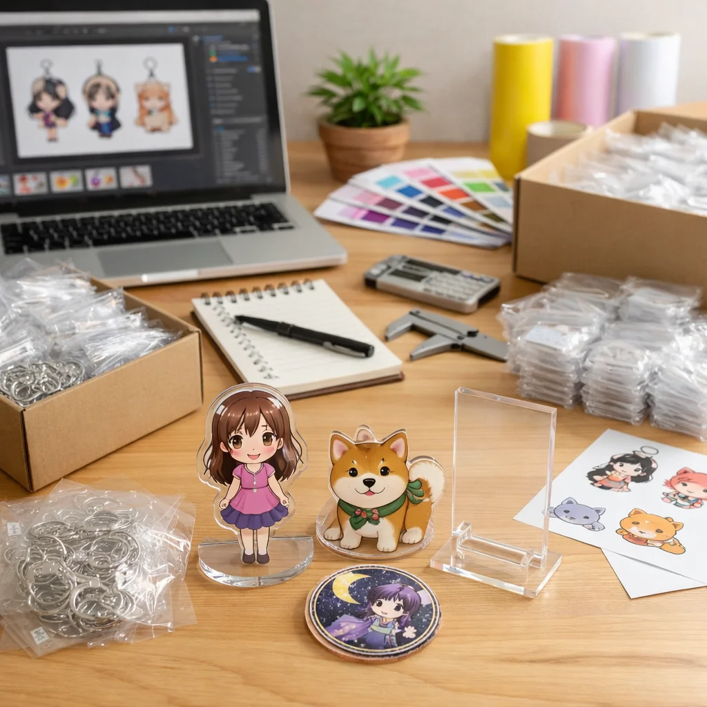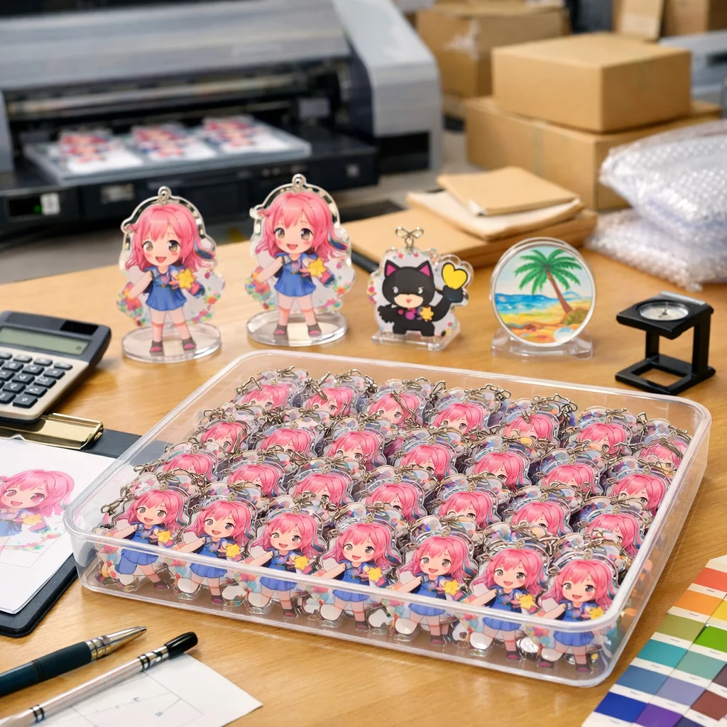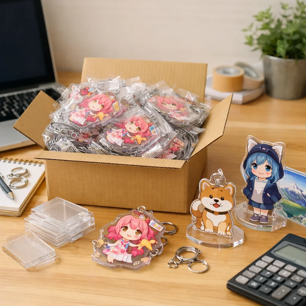 付属品も見逃せない要素です。アクリルグッズに付ける金具や台座の種類も単価を動かす要因です。パーツがシンプルであればコストを抑えられますが、デザイン性を重視する場合は、少し高価なものを選ぶ必要があるかもしれません。