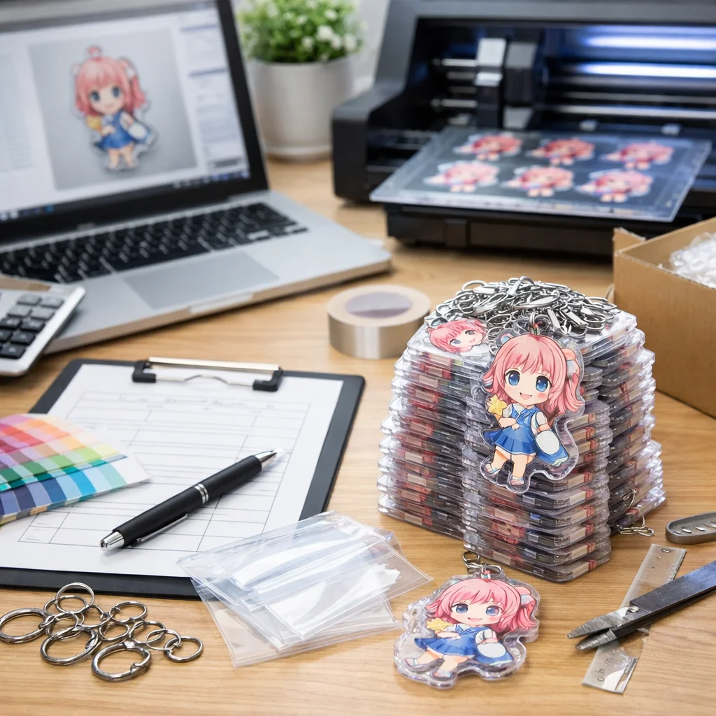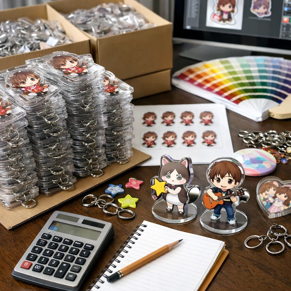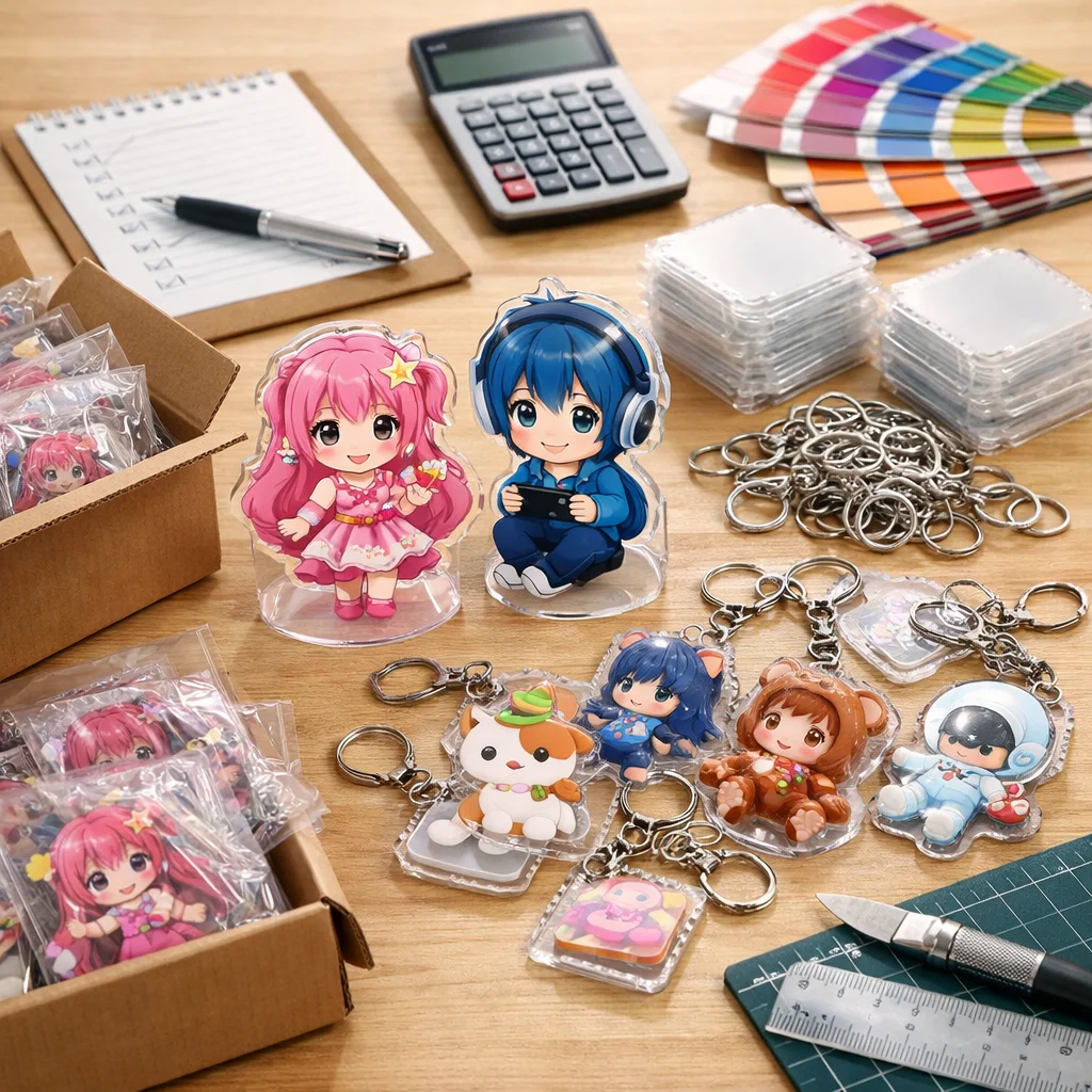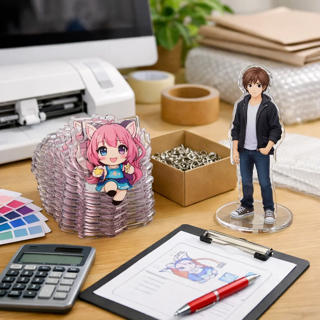 付属品も見逃せない要素です。アクリルグッズに付ける金具や台座の種類も単価を動かす要因です。パーツがシンプルであればコストを抑えられますが、デザイン性を重視する場合は、少し高価なものを選ぶ必要があるかもしれません。