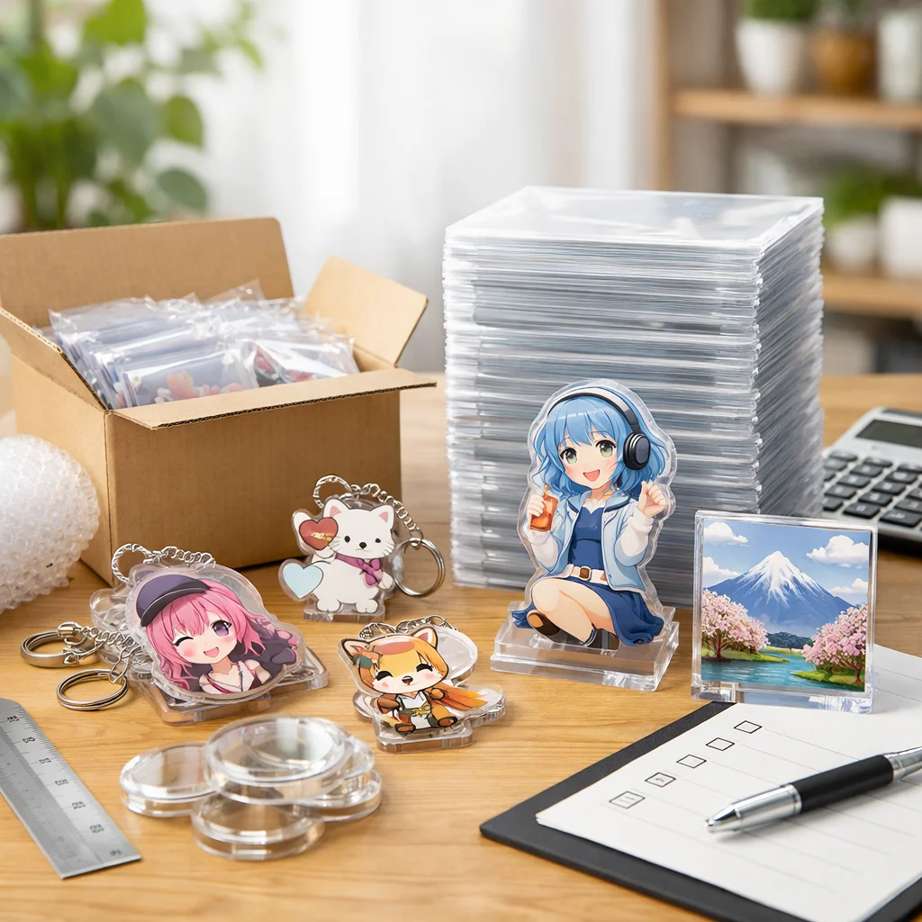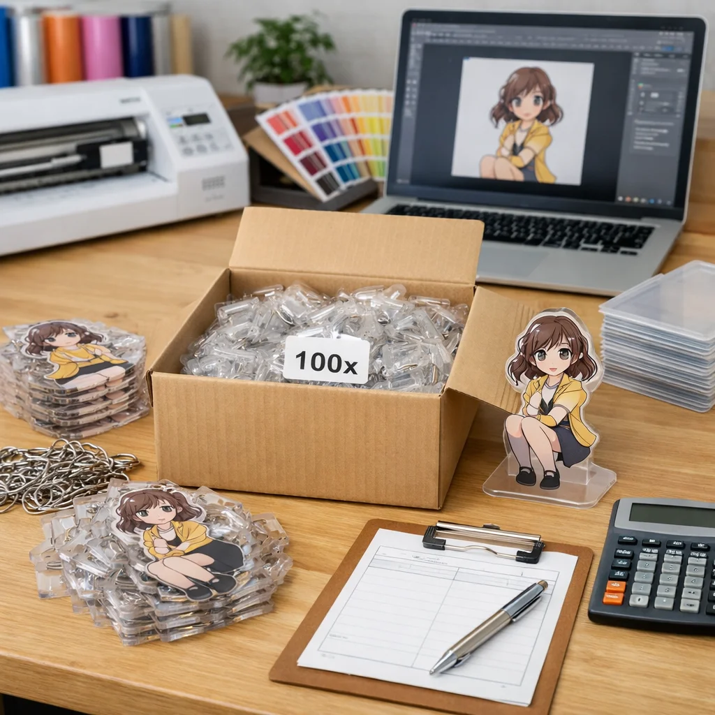 アクリルグッズを100個注文する際は、予算に応じてサイズ、厚み、素材、付属品を慎重に選ぶことが重要です。コストに影響を与える要因を理解し、見積時には用途や希望サイズ、印刷面などの詳細を明確に伝えることで、満足のいく商品が手に入ります。