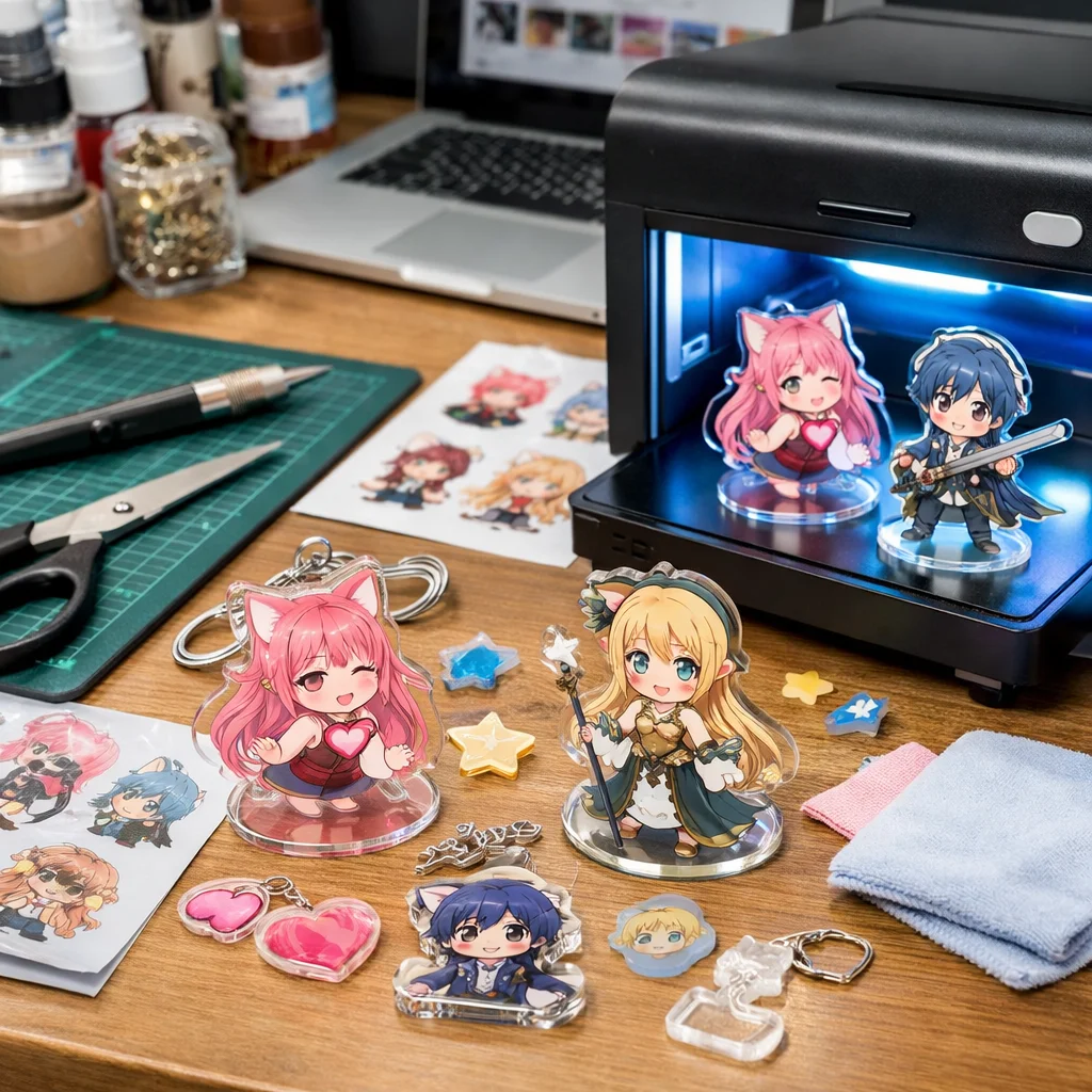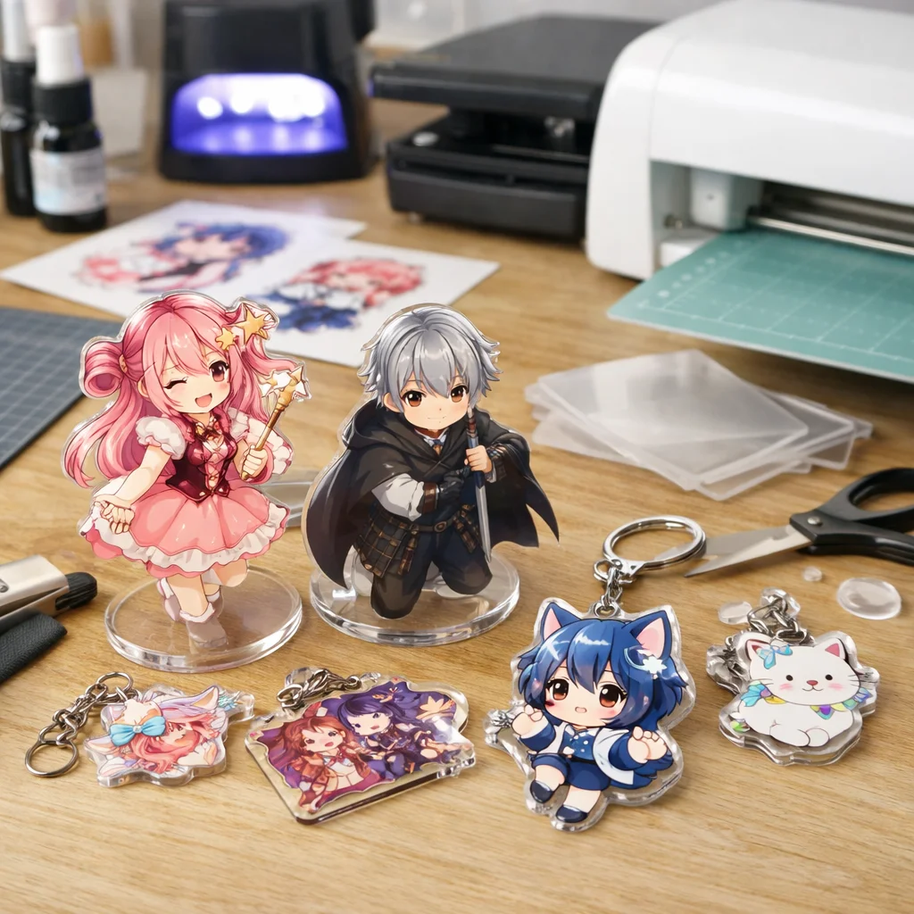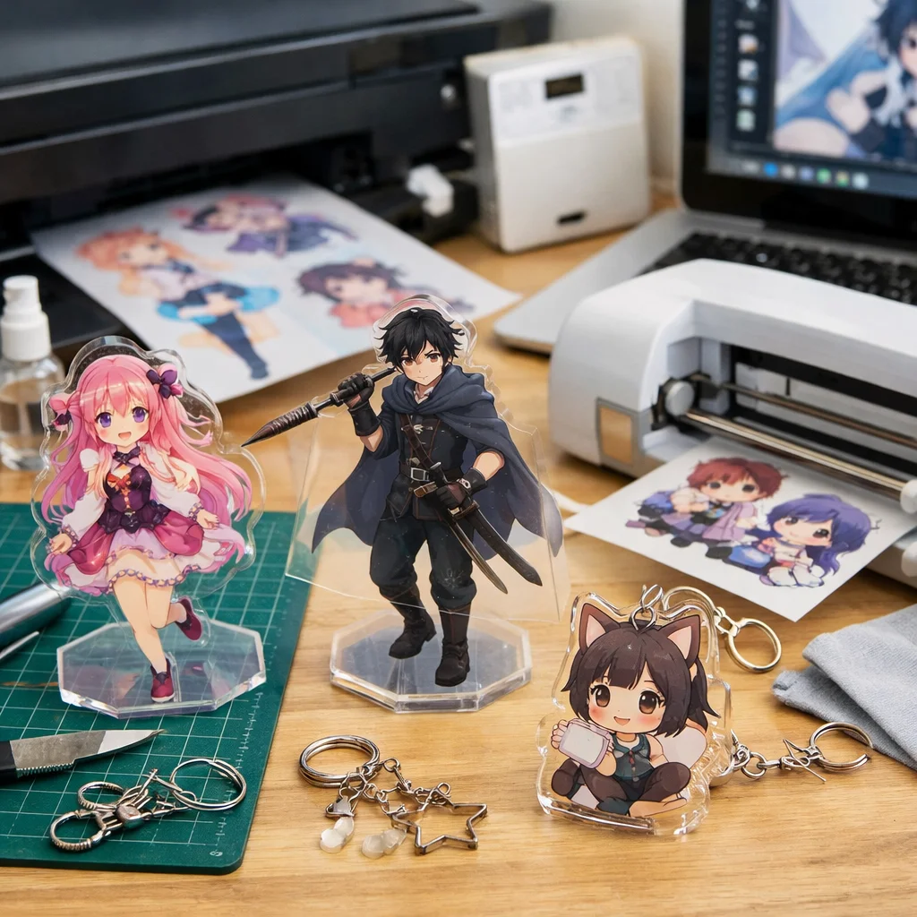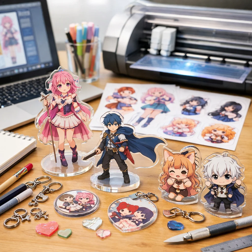 2. アクリル板をカットする方法: アクリル板にデザインを印刷し、アクリルカッターでカットします。硬い素材のため、カットや後処理に注意が必要ですが、独特の質感を持つアクリルグッズを作成できます。